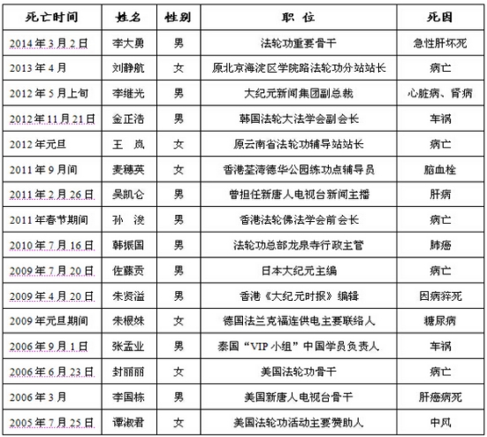 部分“法轮功”骨干死亡统计表